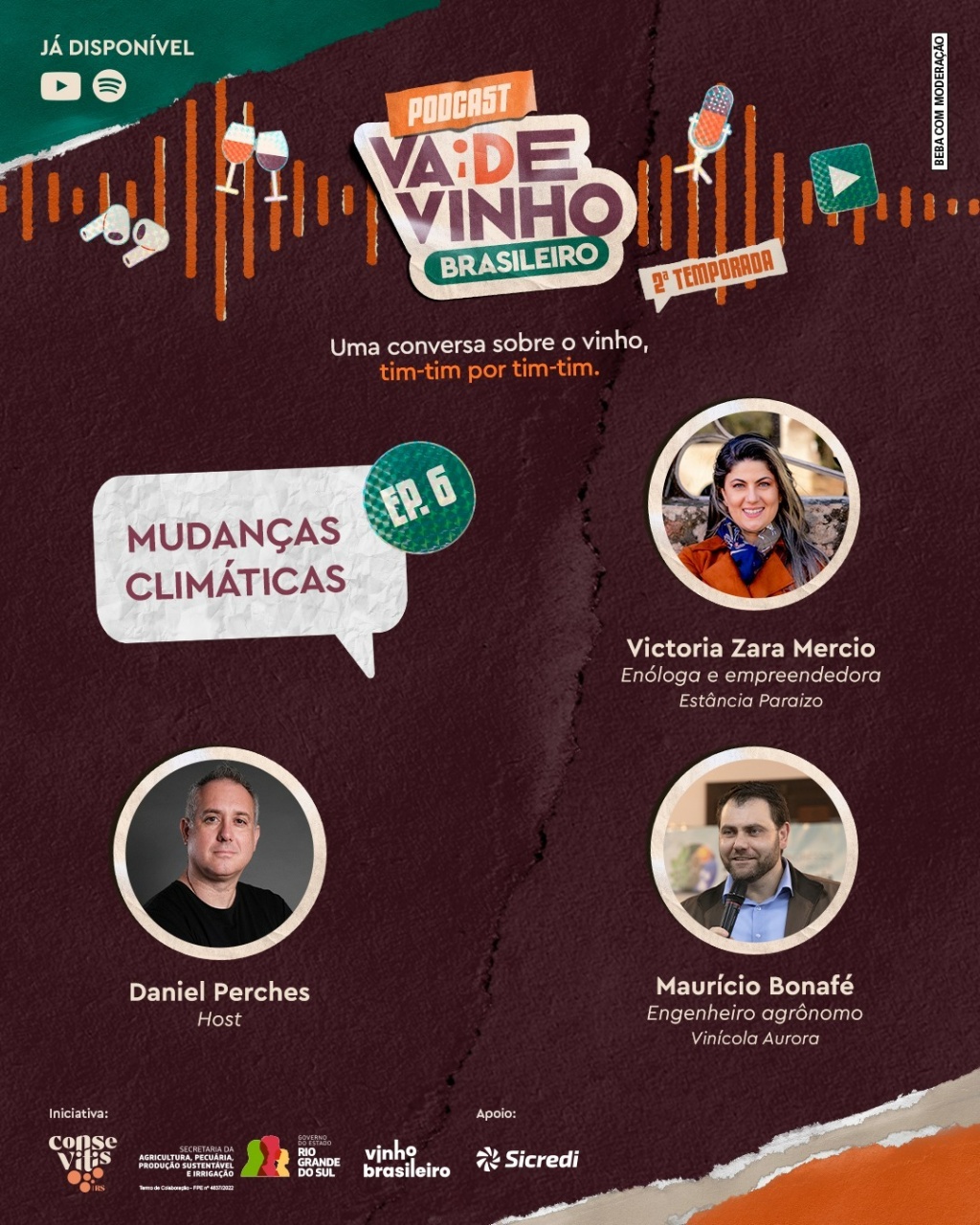 Apresentado por Daniel Perches, o programa mergulha em um dos temas mais desafiadores da atualidade para a vitivinicultura: o impacto do clima sobre a produção e as estratégias de adaptação do setor. Participam do episódio a enóloga e empreendedora Victoria Zara Mercio, proprietária da Estância Paraizo, diretora de Marketing e Comunicação da Associação Vinhos da Campanha Gaúcha e pesquisadora de inovação no Laboratório de Inovação Nitec da UFRGS; e o engenheiro agrônomo Maurício Bonafé, gerente agrícola da Cooperativa Vinícola Aurora, onde lidera frentes de trabalho voltadas à produção vitícola sustentável junto aos cooperados.