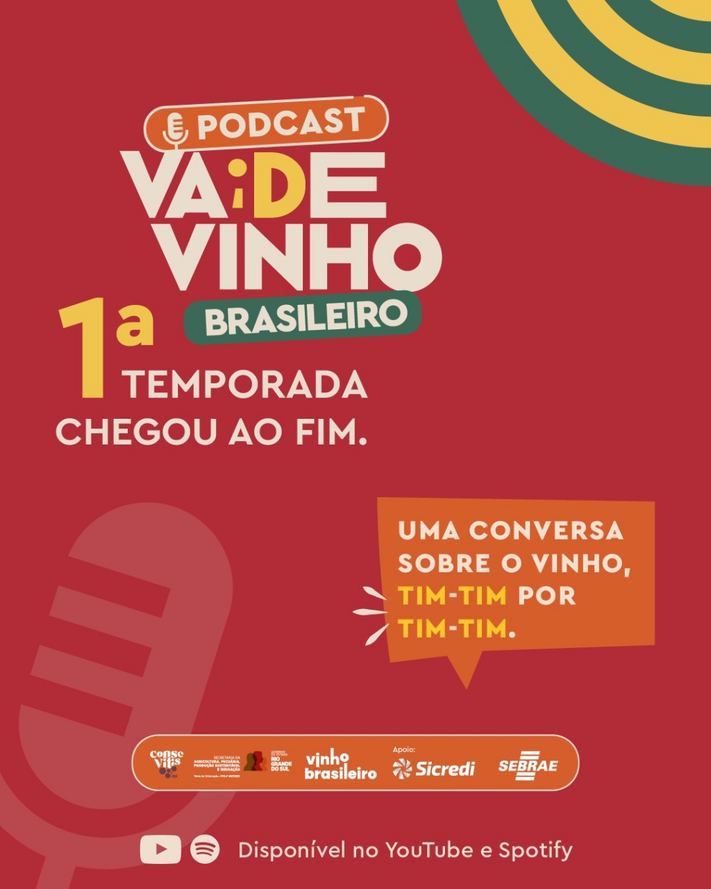 A primeira temporada do podcast Vai de Vinho Brasileiro chegou ao fim com todos os 10 episódios já disponíveis no canal Vinho Brasileiro no YouTube, no Spotify e nas principais plataformas de streaming. Com apresentação do comunicador e especialista em vinhos Daniel Perches, o projeto é promovido pelo Consevitis-RS, em parceria com a Secretaria da Agricultura, Pecuária, Produção Sustentável e Irrigação do Rio Grande do Sul (Seapi-RS), e conta com o apoio do Sicredi e do Sebrae.