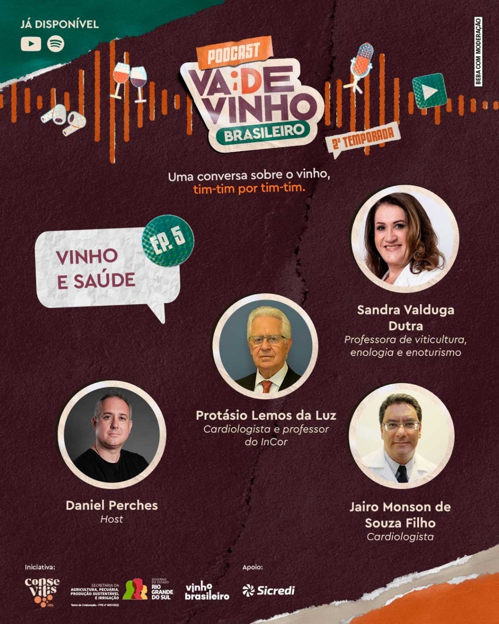 Com o tema “Vinho e Saúde”, o episódio é apresentado por Daniel Perches e reúne três especialistas de destaque para uma conversa baseada em evidências científicas e no conceito de consumo moderado e consciente. Participam do programa o professor Dr. Protásio da Luz, médico e professor titular sênior do InCor da Faculdade de Medicina da Universidade de São Paulo (FMUSP), membro da Academia Brasileira de Ciências e responsável por um estudo apoiado pelo Consevitis-RS e pelo Sicredi; o Dr. Jairo Monson de Souza Filho, médico e pesquisador reconhecido internacionalmente por suas publicações sobre o efeito do vinho e de outras bebidas alcoólicas na saúde humana; e Sandra Valduga Dutra, doutora em Biotecnologia, agrônoma e pesquisadora com atuação em viticultura, enologia e temas relacionados a vinho e saúde.