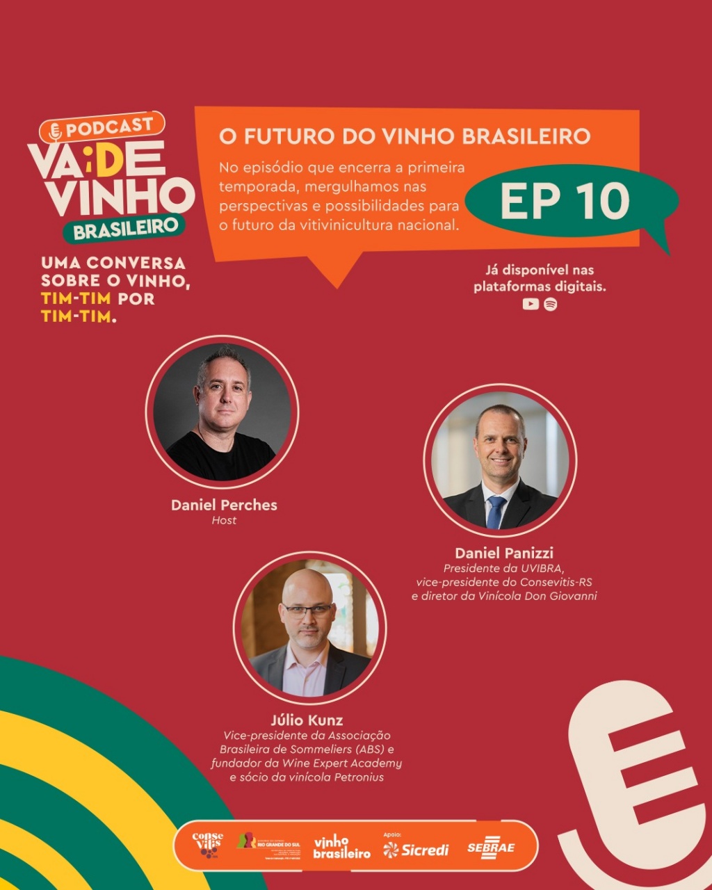 Com apresentação do comunicador e especialista em vinhos Daniel Perches, o programa recebe dois convidados com olhares complementares: o vice-presidente da Associação Brasileira de Sommeliers (ABS), diretor de Relações Institucionais da ABS-RS, fundador da Wine Expert Academy e sócio da vinícola Petronius, Julio César Kunz, e o presidente da União Brasileira de Vitivinicultura (Uvibra), vice-presidente do Consevitis-RS e diretor da Vinícola Don Giovanni, Daniel Panizzi.