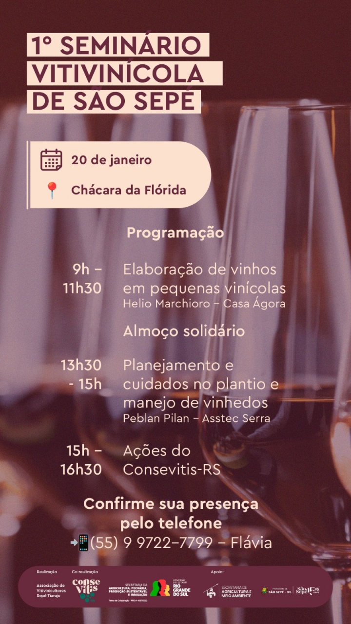 São Sepé sediará, na próxima terça-feira, dia 20 de janeiro, o 1º Seminário Vitivinícola de São Sepé, evento que marca um importante passo para a organização, qualificação técnica e fortalecimento da cadeia da uva e do vinho no município e na região. A programação ocorre na Chácara da Florida e reúne produtores, técnicos, estudantes e interessados no setor vitivinícola, com palestras voltadas tanto à produção de vinhos quanto ao manejo de vinhedos, além da apresentação de ações institucionais de apoio ao segmento. As confirmações de presença devem ser feitas pelo telefone (55) 99722-7799, com Flávia.