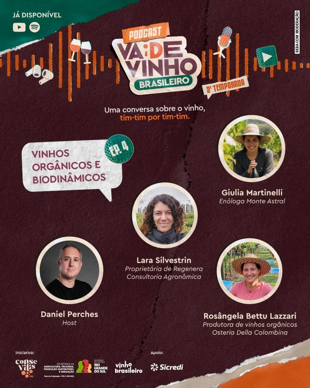 A apresentação é do especialista e influenciador de vinhos Daniel Perches, que conduz o diálogo com três convidadas que reúnem diferentes visões sobre o tema: consultoria técnica, prática no campo e enologia. Participam do episódio a engenheira agrônoma Lara Silvestrin, proprietária da Regenera Consultoria Agronômica, com formação e especializações em Agricultura Biodinâmica no Brasil e no Peru; a produtora Rosangela Bettu Lazzari, que elabora vinhos orgânicos na propriedade da família em Garibaldi e integrou o projeto do primeiro espumante biodinâmico brasileiro com certificação internacional; e a enóloga Giulia Martinelli, da Vinícola Monte Astral, com atuação também no laboratório Enolab, em Pinto Bandeira.